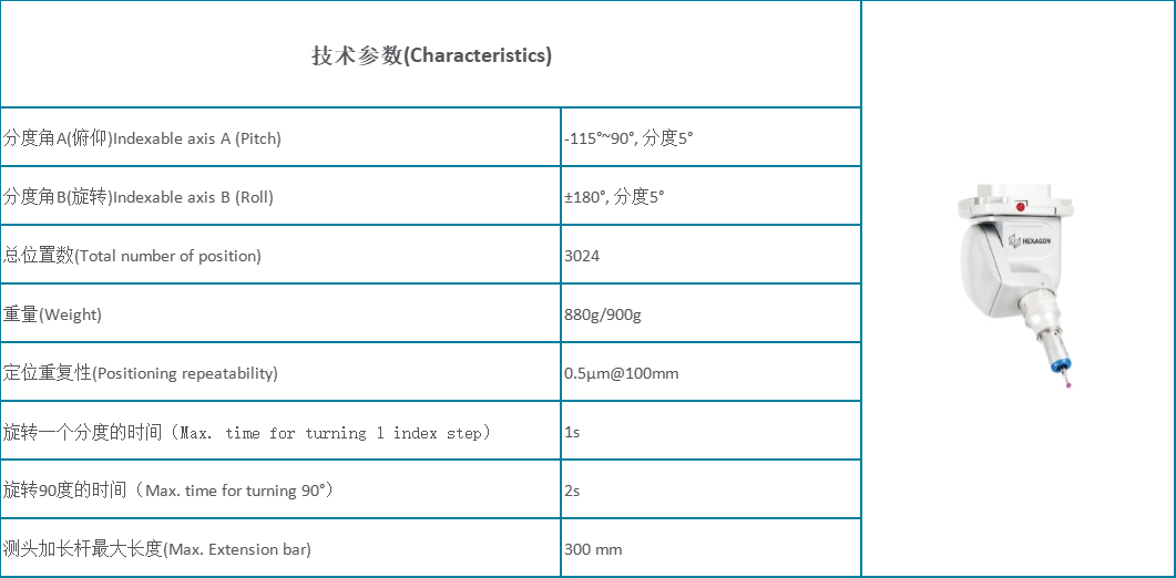 HH-AS-T5可在豎直水平兩個方向自動旋轉(zhuǎn),5°的精細(xì)分度量確保有多達(dá)3024個測頭角度組合.旋轉(zhuǎn)90°僅需兩秒鐘, 可配置長達(dá)300mm的加長桿;可連接各種觸發(fā)式測頭、模擬掃描測頭和非接觸式測頭。特別設(shè)計的結(jié)構(gòu)使得HH-AS-T5在安裝時,部分結(jié)構(gòu)可深入測量機(jī)Z軸內(nèi)部,節(jié)省了安裝空間尺寸,因而增大了測量空間,標(biāo)配HP-S-X1S測頭系統(tǒng) ,搭配M3螺紋探針,允許探針總長度范圍豎直方向在20-115mm,水平方向0-20mm之間